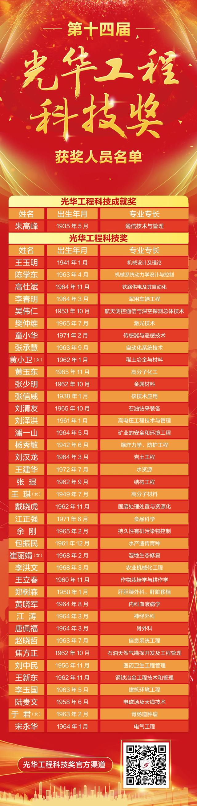 中国工程院第十六次院士大会30日在京举行,第十四届光华工程科技奖颁奖仪式在大会开幕式上举行。我国杰出的通信技术与管理专家朱高峰院士荣获光华工程科技奖成就奖,清华大学机械工程系教授王玉明、中国探月工程总设计师吴伟仁等39位科学家荣获光华工程科技奖。