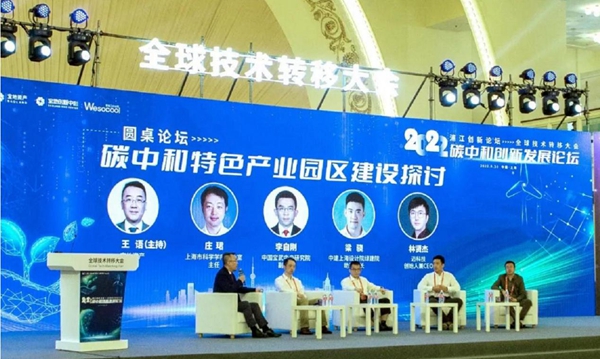 在圆桌论坛上,宝地资产总裁王语、上海市科学学所产业室主任庄珺、中国宝武中央研究院副院长李自刚、中建上海设计院绿建院助理院长梁骁、迈科技创始人兼CEO林贤杰围绕碳中和特色产业园区建设相关问题进行了讨论。